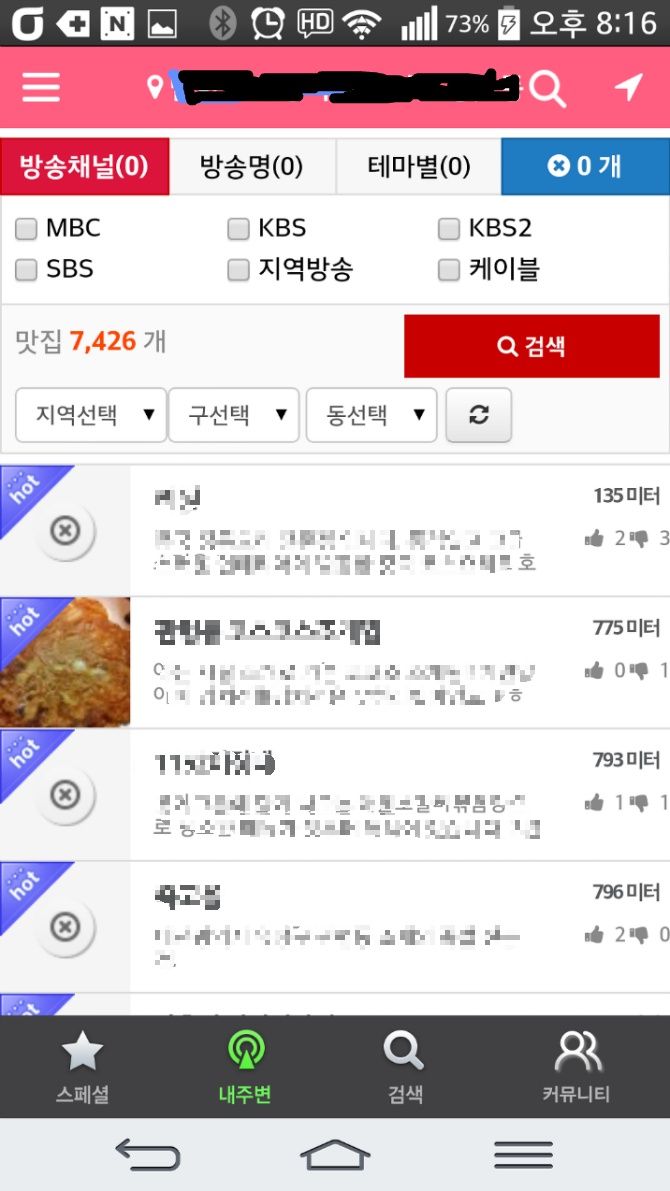 1) 주변 맛집 검색(TV출현 맛집 연동가능,일반맛집 검색)