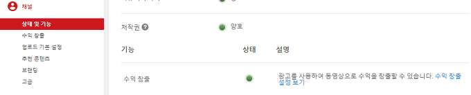 7) 다시 채널로 돌아와 상태 및 기능에 보면 수익창출란에 수익창출 설정보기라는 메뉴가 보입니다.클릭해줍시다.