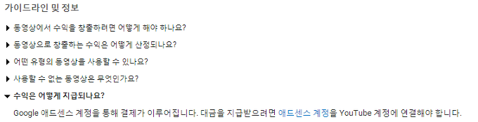 8) 가이드라인이 보이는데 "수익은 어떻게 지급되나요"을 열어보면 "애드센스 계정"을 연결해야한다라고 뜹니다.