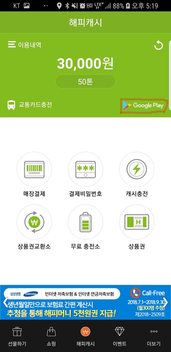 해피머니 앱으로 들어가면 아래 그리처럼 구글플레이 마크가 보입니다.(PC버전도 마크가 있습니다.)
